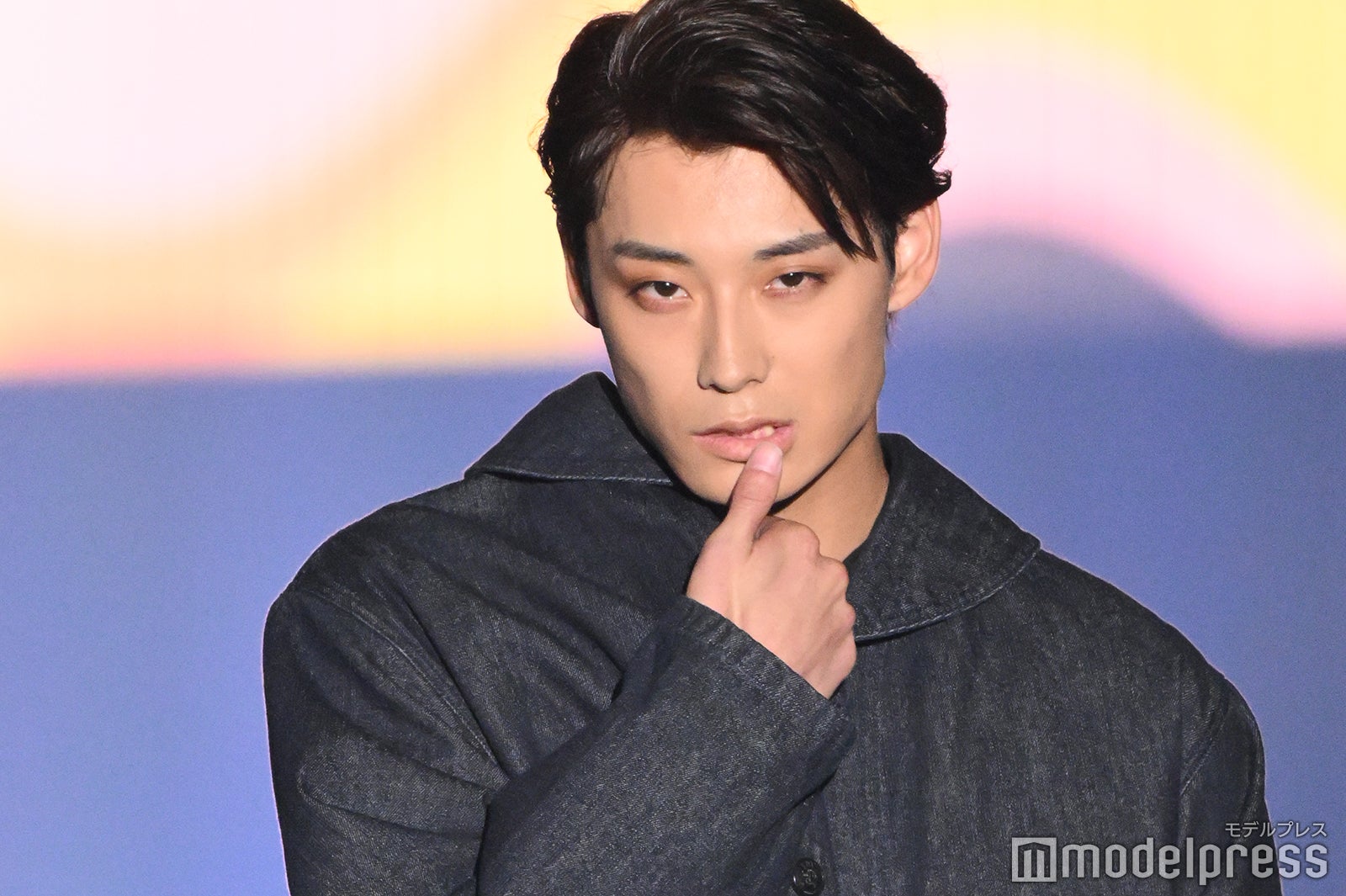 高松は個性的で自由な印象を与える柄のトップスとボトムスをシックな黒デニムジャケットで締めたスタイルで登場。ランウェイトップでは、親指で唇を拭うセクシーな仕草で視線を集めていた。