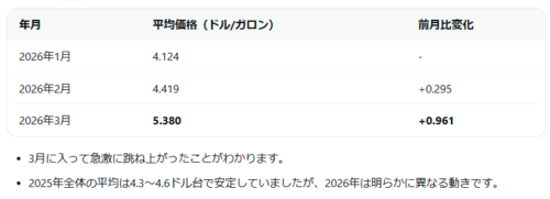 ¥ã£ãŠãããäŸ¡æ Œãæ¥æ¿ã«äžæããŠããŸããAAAïŒã¢ã¡ãªã«èªåè»åäŒïŒã®ææ°ããŒã¿ïŒ2026幎4æ7æ¥æç¹ïŒã«ãããšãããµã³ãŒã«ã¹ã»ãã³ã°ããŒãå°åã®ã¬ã®ã¥ã©ãŒã¬ãœãªã³ã®å¹³åäŸ¡æ Œã¯1ã¬ãã³ããã6.048ãã«ïŒçŽ1,100åååŸãçºæ¿ã«ããïŒãšãå·å