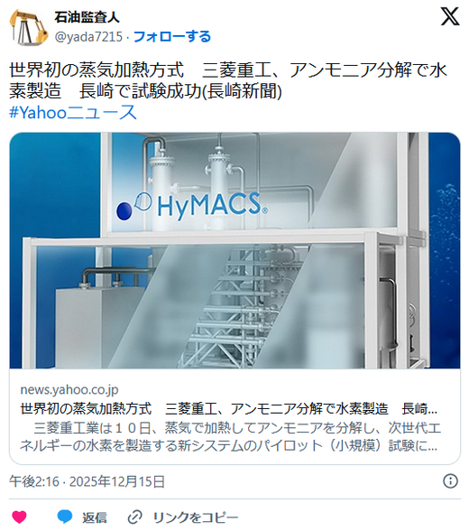 三菱重工総合研究所長崎地区(長崎市)で成功したと発表した。蒸気で加熱してアンモニアを分解する方式は世界で初めて。